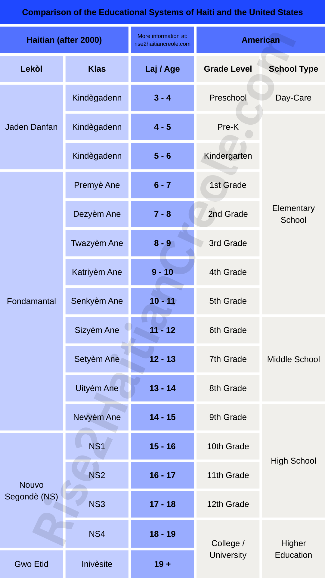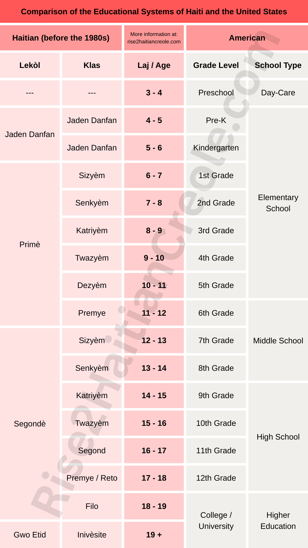 - We created our infographic based on conversations with dozens of people from Haiti. The official education system in Haiti may differ, similar to how the meaning of elementary and middle school can differ depending on where you are in the U.S. We’re sharing this information as a Haitian would explain it.